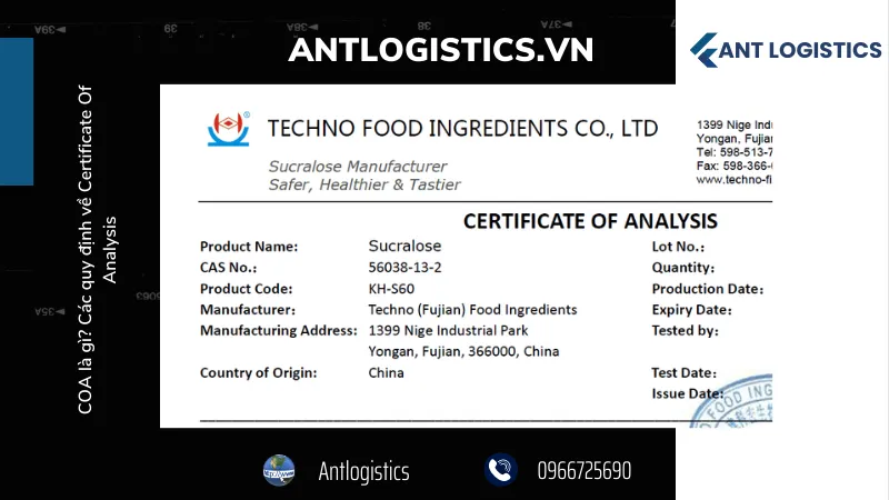 COA là từ viết tắt của cụm từ Certificate Of Analysis, trong tiếng Việt có nghĩa là Giấy Chứng nhận Phân tích. Đây là một chứng chỉ quan trọng và bắt buộc được yêu cầu đối với các sản phẩm xuất khẩu để đảm bảo chất lượng và an toàn của sản phẩm đó. Trong bài viết này, Antlogistics sẽ cùng tìm hiểu về COA là gì, các quy định liên quan đến Certificate of Analysis và tại sao nó quan trọng đối với các ngành công nghiệp sản xuất.